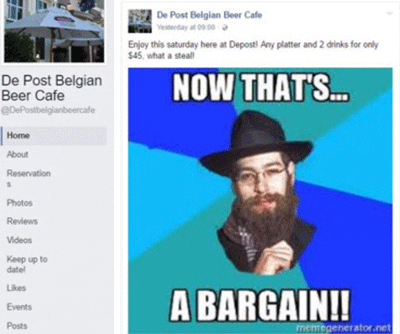 A bar in Auckland has advertised a meal deal on Facebook and accompanied it with a photo of an Orthodox Jew. The caption on the post reads: “now that’s a bargain.”