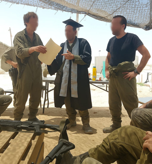 The ceremony was held at the outpost where Ohad’s battalion is currently stationed deep inside the Gaza Strip. After several intense days of operations, Ohad’s battalion commander gathered Ohad’s unit and presented him with his diploma. Wearing a cap and gown over his IDF uniform, Ohad recited the doctor’s oath (Hippocratic Oath) to the applause of his fellow soldiers.