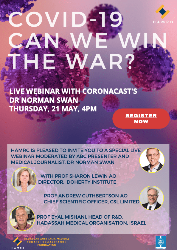 Hadassah Australia is honoured to present Dr Norman Swan and a panel of distinguished experts in medical research and vaccine developments to discuss challenging questions surrounding Covid-19 and what it means for Australia’s research future.