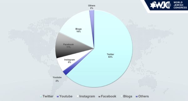 The WJC research, conducted by the Israeli monitoring firm Vigo Social Intelligence, also determined that an overwhelming 63 percent of all antisemitic content online can be found on Twitter.