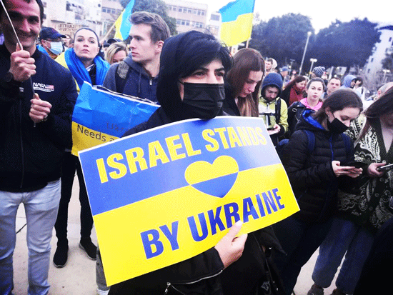 Demonstration at HaBima square in Tel Aviv against the Russian invasion of Ukraine and against Putin, ahead of a screening of Ukraine’s President Volodymyr Zelensky’s speech. Tel Aviv, Mar 20, 2022. Photo by Uri Lev Tager/TPS