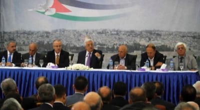 Palestinian Authority leader Mahmoud Abbas (center) attends a meeting of Palestinian businessmen in Ramallah April 29, 2014. The Palestinian National Fund, often in partnership with the P.A., pays salaries to imprisoned Palestinian terrorists and their families. Credit: Issam Rimawi/Flash90.
