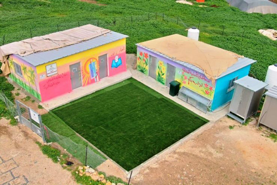The new school is adorned with colourful wall murals and covered with tarpaulin sheets that are meant to hide the illegal structure from the IDF Civil Administration inspectors.