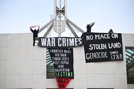 Police arrested four people – three men and one woman – who hung banners from the roof of Parliament House that accused Australia of complicity in “war crimes” and “genocide”.