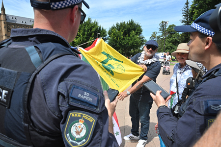 Police checking green and yellow flags during a Pro-Palestine rally in Sydney, Sunday, October 6, 2024. Rallies and vigils across multiple cities over the weekend mark the anniversary of the October 7 attacks in Israel. (AAP Image/Mick Tsikas)