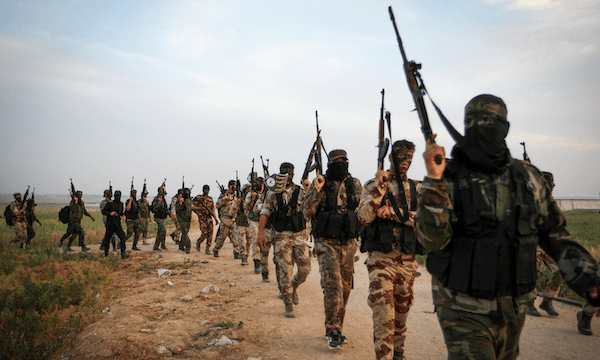 Palestinian Islamic Jihad members march during a military drill near the border with Israel, east of the town of Khan Younis in the southern Gaza Strip, on March 27, 2018. Photo by Abed Rahim Khatib/Flash90.