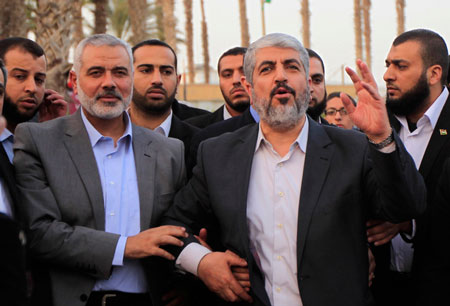 Hamas leader in exile Khaled Meshaal (right) and Hamas politburo chief Ismail Haniyeh in the southern Gaza Strip on Dec. 10, 2012. Photo by Abed Rahim Khatib/Flash90.