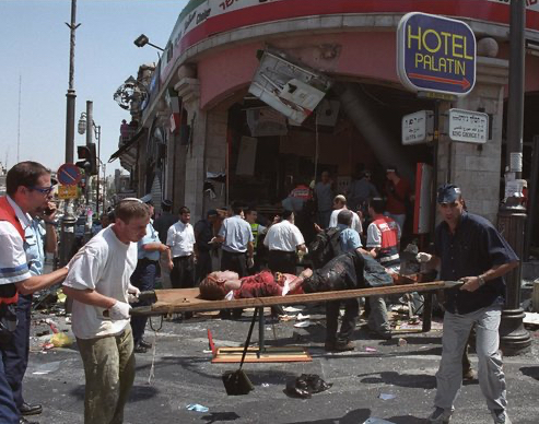 The aftermath of the suicide bombing at the Sbarro pizzeria in Jerusalem on Aug. 9, 2001, that killed 15 people, including two Americans, and wounded around 130 others. Photo by Flash90
