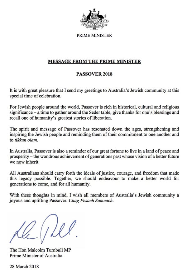 Australia’s Prime Minister Malcolm Turnbull sends a special message for Pesach.