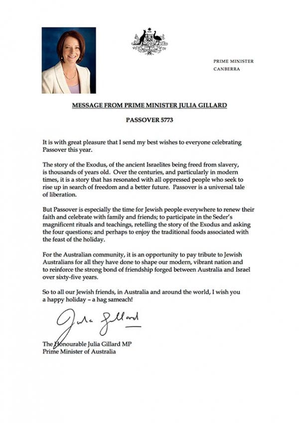 Australian Prime Minister Julia Gillard has a Pesach message for Jewish Australians…