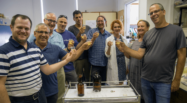 Team of researchers with new-old beer bottles produced in the labs. Photography: Yaniv Berman, courtesy of the Israel Antiquities Authority.