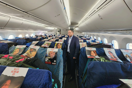 Photos of captive Israelis on seats of El Al humanitarian delivery flight