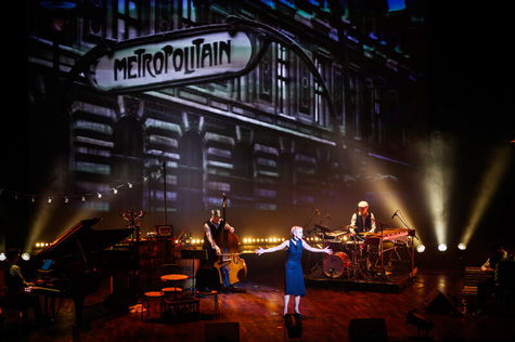 Important, too, is the black and white, big screen backdrop, a visual tapestry of previously unreleased photos and video from the Piaf era.