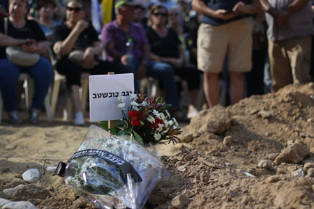 Yagev Buchshtab and Nadav Popplewell are laid to rest at Kibbutz Nirim on Aug. 21, 2024. They were among six bodies recovered by soldiers from Gaza. Photo by Adele Raemer/TPS-IL