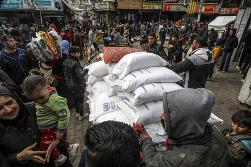Palestinians receive food supplies at an UNRWA school in Rafah, the southern Gaza Strip, Jan. 28, 2024. Photo by Abed Rahim Khatib/Flash90.