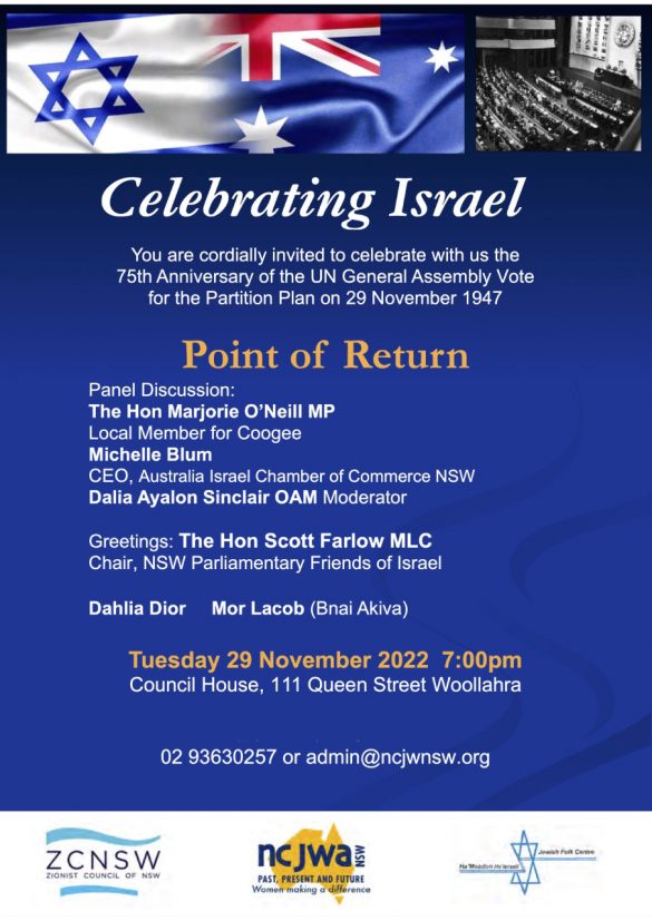 Founder of NCJWA Celebrating Israel event in 2005, Dalia Ayalon Sinclair, NCJWA NSW Past President, is back in Australia to produce ”Point of Return” to highlight the significant contribution that Australia had in the passing of the resolution and to acknowledge the unique friendship between Australia and Israel, and the special role that Australia played in the short history of Israel with the ongoing support of Australian governments.