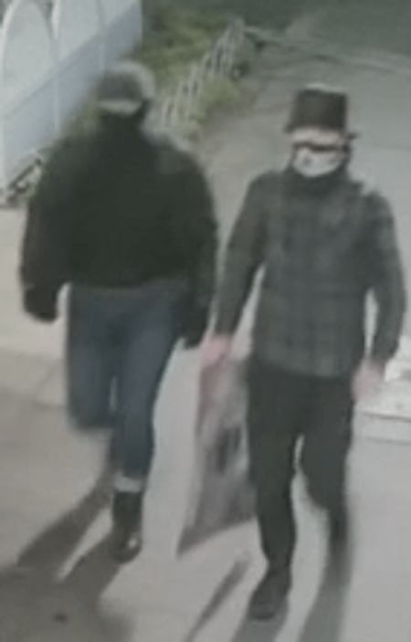 Police described the first man as Caucasian, wearing a black bucket hat, a black and white balaclava, black and grey checkered shirt, black pants and black shoes. The second man is of solid build, wearing a black baseball cap, black ski mask, black rain jacket, black top, blue denim jeans, black gloves and black shoes.