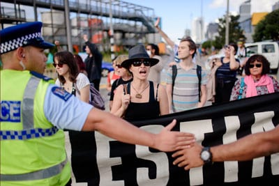 A line of police prevented conflict restrained a small group of Auckland Peace Action protesters at an Israel 70th anniversary event.