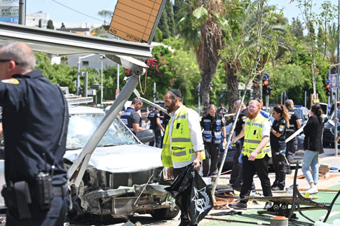 Emergency responders in Tel Aviv, where seven people were injured in a Palestinian car-ramming and stabbing attack on July 4, 2023