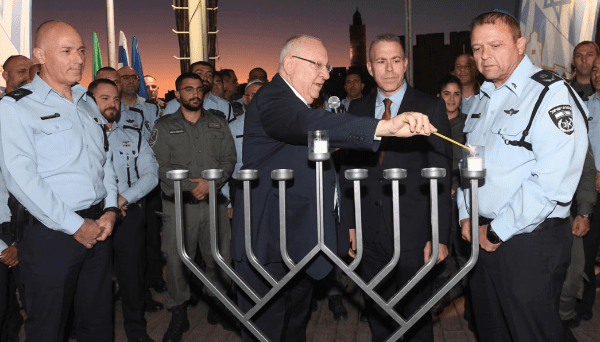 President Reuven (Ruvi) Rivlin lit the first candle of Chanukah with the men and women of the David Sector of the Israel Police and Gimmel Company of the Border Police in the Old City of Jerusalem.