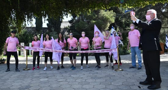 The president set the runners on their way – women who have and are recovering from breast cancer, for a run that marks the end of the “Running Around The World” awareness campaign for breast cancer. The runners set off for a celebratory run from the gates of Beit HaNasi with pink shirts to thank the thousands of Israelis who participated and ran over the last month to raise awareness of early screening for the disease.
