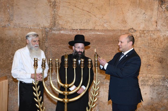 Prime Minister Naftali Bennett lights the first candle at the Kotel. Photo: Amos Ben-Gershom (GPO)