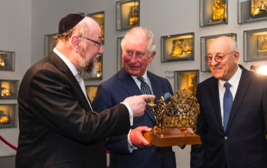 Photo Present – From Left to right the Chief Rabbi of the UK, Ephraim Mirvis, HRH Prince of Wales and the Chairman of the Board of Directors of The Israel Museum Isaac Molho.