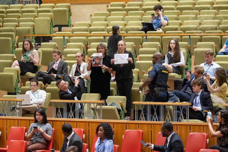 Yaffa Ben-David, who leads the Israel Teachers Union, and a yet-unidentified woman to her left protest during the U.N. Security Council meeting on the situation in the Middle East, including the Palestinian question, on July 17, 2024. Credit: Eskinder Debebe/U.N. Photo.
