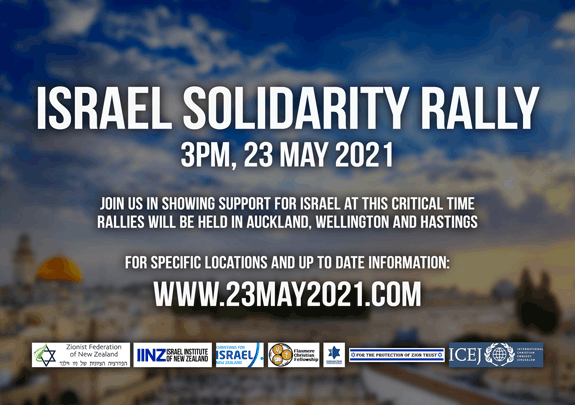 Rallies will be held next Sunday (23 May) at 3:00 PM in Auckland, Wellington and Hastings in order to show publicly support for Israel’s right to defend herself and for her right to respond to unwarranted aggression from the Islamist terror groups operating from Gaza.