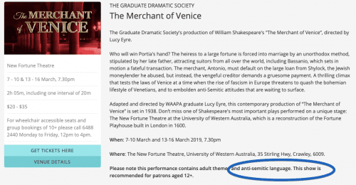 Lucy Eyre confirmed that the program contains the wording: PLEASE NOTE This play contains antisemitic language.