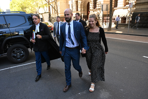 Thomas Sewell (centre) and defence barrister Dermot Dann (left) depart during a lunch break at the Court of Appeal in Melbourne, Friday, March 22, 2024. Photo: James Ross/AAP