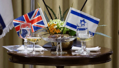 The flags of Britain and Israel at the Presidential residence in Jerusalem.