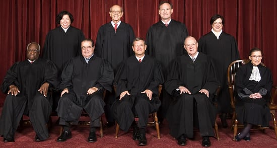 The U.S. Supreme Court in 2010. Top row (from left): Associate Justice Sonia Sotomayor, Associate Justice Stephen G. Breyer, Associate Justice Samuel A. Alito and Associate Justice Elena Kagan. Bottom row (from left): Associate Justice Clarence Thomas, Associate Justice Antonin Scalia, Chief Justice John G. Roberts, Associate Justice Anthony Kennedy and Associate Justice Ruth Bader Ginsburg.