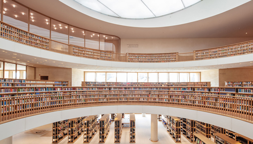 Swiss architecture firm Herzog & de Meuron conceived the Main Reading Halls as a “well of books” forming a void of offset circles, rising upwards, and culminating in a large circular skylight. Light passes through each of the three levels to connect the Main Reading Halls, public spaces, and administrative areas to the collection below. Wooden bookshelves line the void, allowing the books to shape the visual experience of the space, and surrounding the reader.
