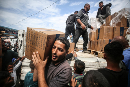 Boxes of humanitarian aid are distributed to residents of Deir al-Balah on April 8, 2024 ahead of the Eid al-Fitr holiday. Photo by Majdi Fathi/TPS