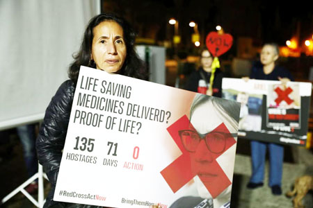 The families of Israeli hostages demonstrate in Tel Aviv against the International Red Cross during a visit by IRC President Mirjana Spoljaric on Dec. 14, 2023. The families criticized the Red Cross for not doing enough to get access to their loved ones. Photo by Gideon Markowicz/TPS