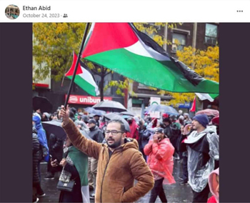 On Oct. 27, 2023, Abid posted a flyer on Facebook for another anti-Israel rally co-sponsored by the “Palestinian Youth Movement,” which openly supports terrorist “martyrs.”