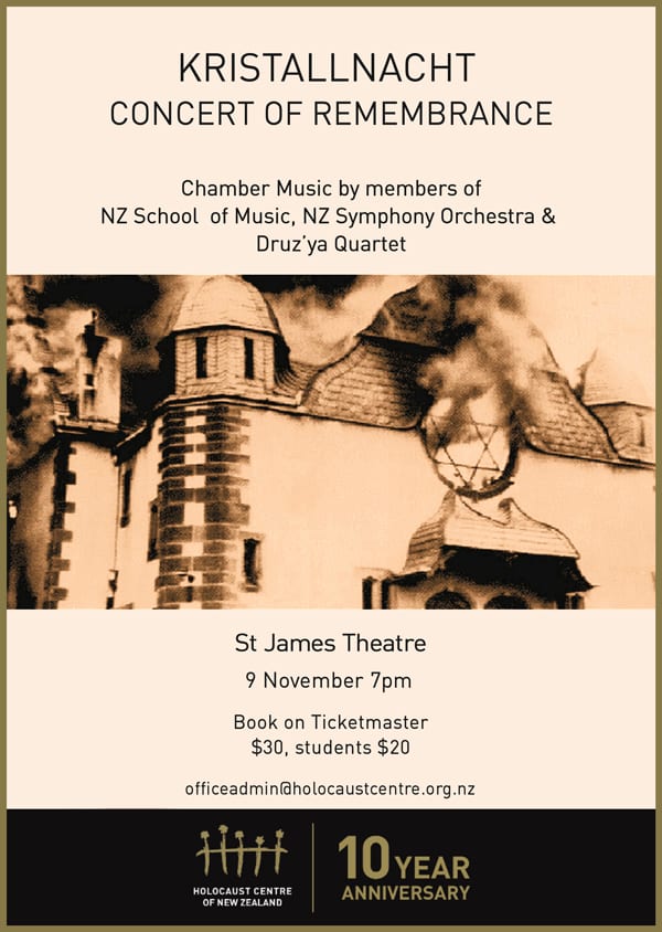 The Holocaust Centre of New Zealand and the NZ School of Music are promoting what has become their annual remembrance of the death and destruction that took place on 9-10 November 1938.