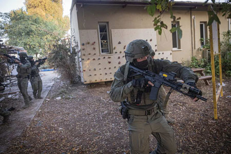 Israeli counter-terror forces patrol in Kibbutz Be’eri, near the Israeli-Gaza border in southern Israel. Oct. 22, 2023. Photo by Chaim Goldberg/Flash90.