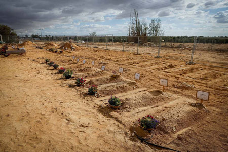 Graves of Kibbutz Be’eri residents whom Hamas terrorists murdered on Oct. 7, at Kibbutz Revivim, south of Beersheva, Nov. 15, 2023. Photo by Chaim Goldberg/Flash90.