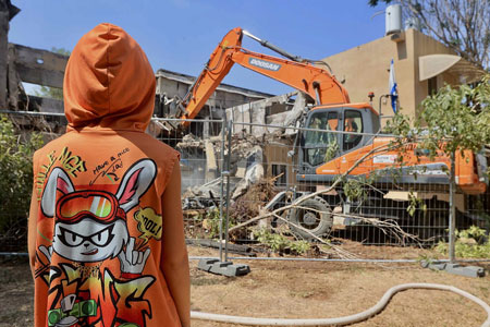 A bulldozer destroys a house that was damaged during the Oct. 7 massacre in Kibbutz Be’eri near the Israeli border with the Gaza Strip, as part of a project rebuilding the destroyed homes and infrastructure in the Kibbutz, July 7, 2024. Photo by Oren Cohen/Flash90.