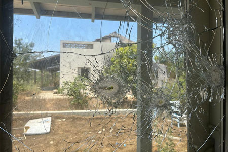 Bullet impacts on the window of Avida Bachar’s safe room in Kibbutz Be’eri, July 22, 2024. Credit: Amelie Botbol.