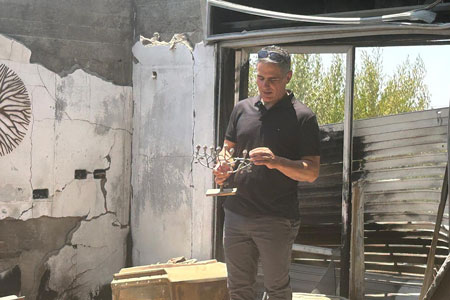 Looking through the rubble, Shevo grabbed a burnt Hanukkiah and explained its significance.