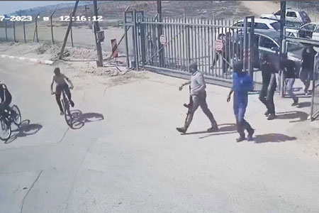 A Hamas terrorist and Palestinian civilian accomplices enter Kibbutz Be’eri to murder, rape and torture Jews, on Oct. 7, 2023. Source: Kibbutz Be’eri security camera.