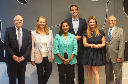 AIJAC National Chairman Mark Leibler, Zoe McKenzie MP, Michelle Ananda Rajah MP, Josh Burns MP, Gemma Tognini, AIJAC Executive Director Dr Colin Rubenstein