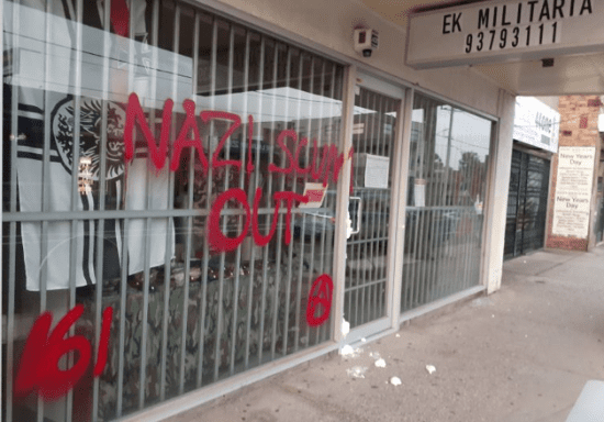 On their Facebook page, Anarchists Worldwide reported: “On the night of January 19th-20th, 2020, we paid a visit to the premises of the ‘EK Militaria’ store at 439 Gaffney Street in Pascoe Vale. After disabling a nearby surveillance camera, we sabotaged the entrance locks to the store, spray painted antifascist slogans on the store facade and smashed one of the storefront windows that was displaying a US Confederate flag.
