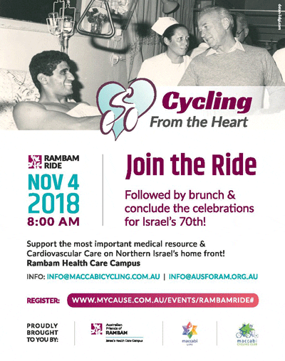 Do you love cycling!! Then come and join Maccabi Cycling Club for a 50 km ride in Melbourne to support Israel’s Rambam Hospital’s research into sudden cardiac arrest. You will be joining the Ambassador of Israel who is also riding to help raise funds for this amazing cause.