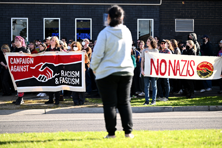 Supporters of the ‘Campaign Against Racism and Fascism’ march during a protest against a neo-Nazi gym meet-up in Sunshine West, Melbourne, Saturday, July 29, 2023. (AAP Image/Joel Carrett)