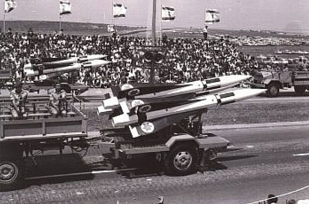 U.S.-made MIM-23 Hawk anti-aircraft missiles on display at a military parade in Tel Aviv in 1965. Credit: Avraham Amir via Wikimedia Commons.