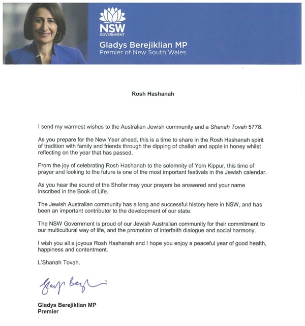 NSW Premier Gladys Berejiklian and other NSW politicians send Rosh Hashanah messages.